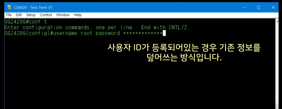 신규 생성과 동일하게 유저네임 명령어를 사용하여 변경합니다. 비밀번호는 기존 정보를 덮어쓰는 방식이며, 마스킹 처리되어 나타납니다.