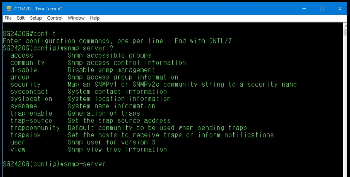 예를 들어 snmp 서버에서 사용 가능한 명령어를 확인할 경우, 물음표를 입력하면 하단에 사용 가능한 명령어가 표시됩니다. 원하는 문자열로 시작하는 명령어를 확인하고 싶을 경우, 특정 문자를 입력 후 물음표(?)를 입력하면 해당 문자열로 시작하는 명령어가 표시됩니다. (ex t로 시작하는 명령어 확인하고 싶을 경우, snmp-server t? 입력 후 엔터)