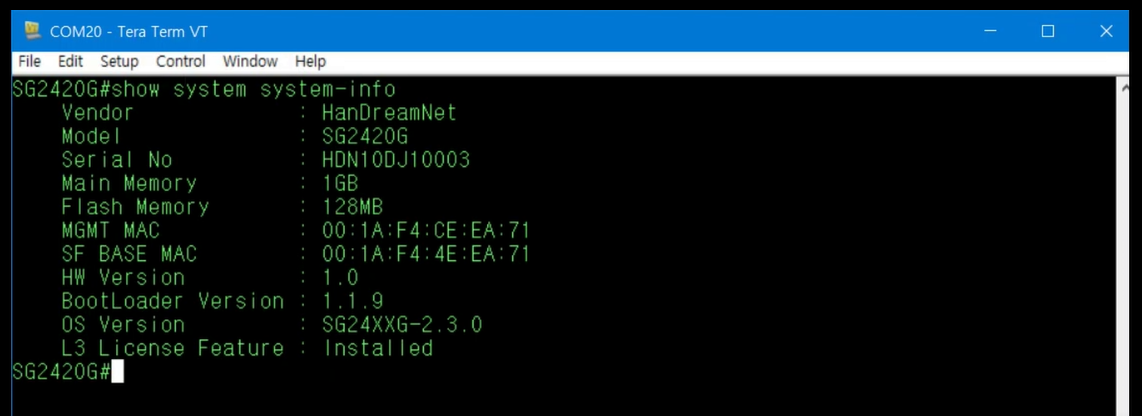 show system system-info를 입력하면 모델명, S/N, MAC 주소, L3 License 등 정보를 확인할 수 있습니다.