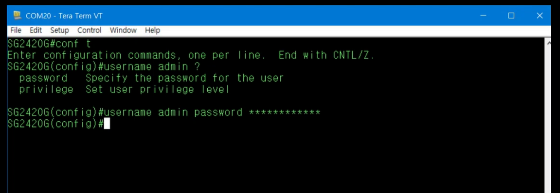Config모드에서 유저네임 명령어를 사용하여 신규 사용자를 추가 후, 비밀번호를 생성해줍니다.