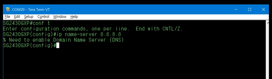 보안스위치의 경우 보안 기능 확인서에서 요구되는 기능 사양에 따라 DNS 기능이 기본 비활성화되어 출고됩니다.