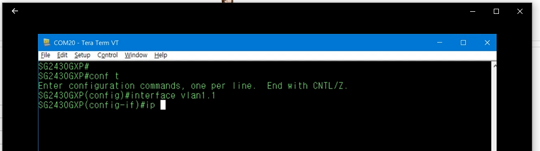 우선 IP 설정을 위해서는 config 모드에서 관리용 IP를 설정할 VLAN으로 진입해야 합니다.