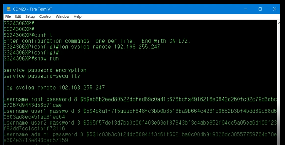 완료된 설정은 show run 명령을 사용해서 확인할 수 있습니다.
