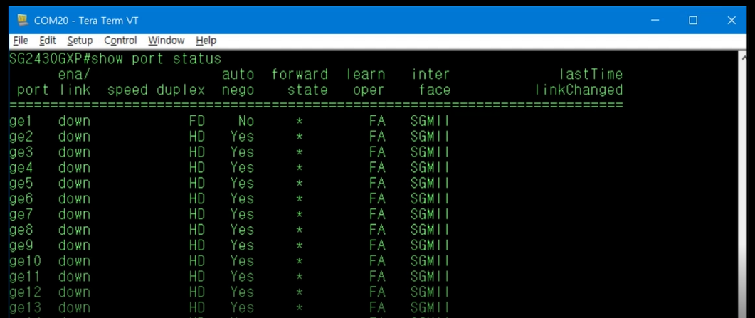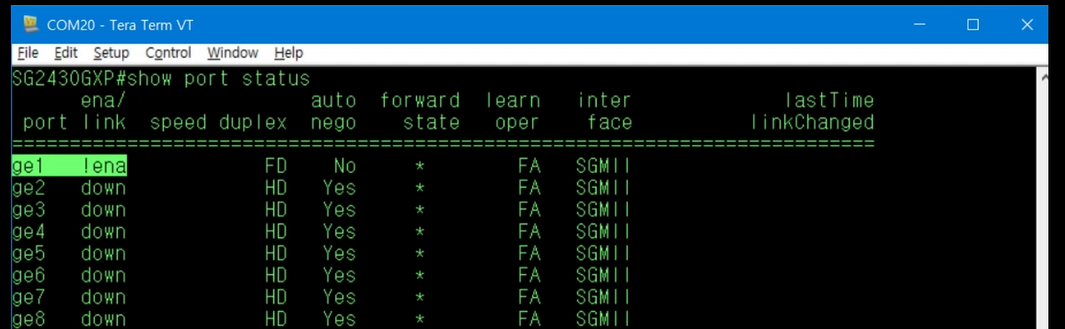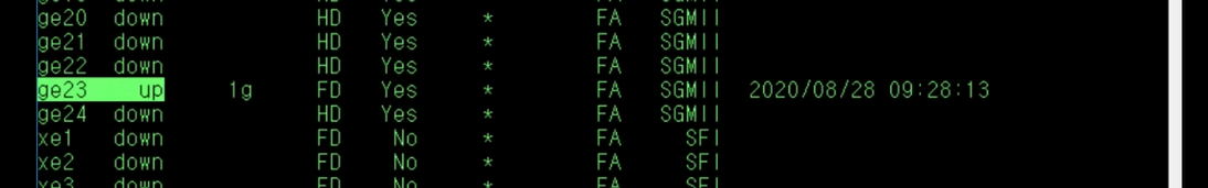 show port status 명령을 입력하면 ge23의 Link가 1g, Duplex는 Full, 마지막 Link의 변경 시간은 2020년 8월 28일 오전 9시 28분 13초인 것을 확인할 수 있습니다.