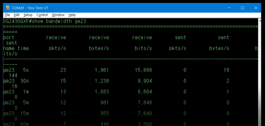 ge23의 Traffic 사용량을 확인하려면 Top Mode에서 show bandwidth ge23을 입력합니다. 명령을 입력하면 평균 5초, 30초, 1분, 5분, 15분, 60분의 평균 송수신 Traffic을 pkt, byte, bit 단위로 확인할 수 있습니다.