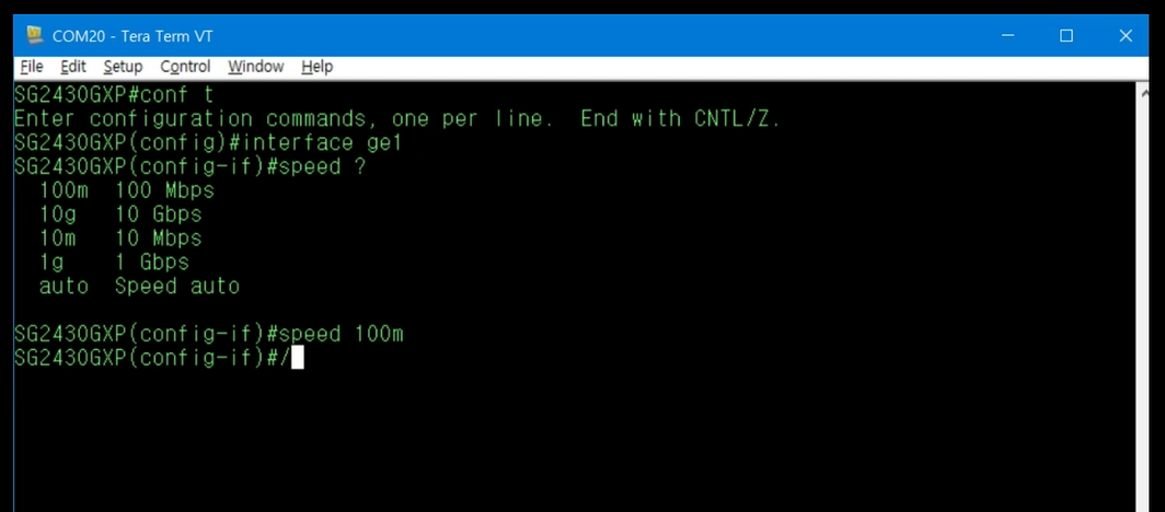 예시 ) ge1의 전송 속도를 100m로 변경하려면, Interface Mode에서 speed 100m 명령을 입력합니다.