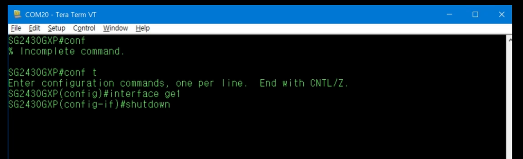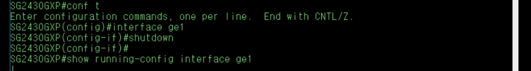 ge1이 활성화되었는지 확인하려면 Top Mode에서 show running-config interface ge1 명령을 입력하거나, Top Mode에서 show port status 명령을 입력하면 !ena 표기가 사라진 것을 확인할 수 있습니다.