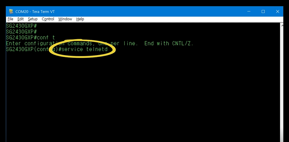 Config Mode에서 service telnetd 명령을 입력하면 Telnet 서비스가 활성화 됩니다.