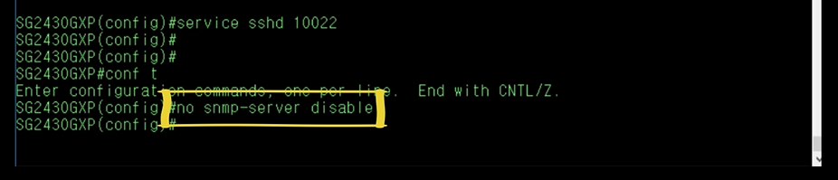 Config Mode에서 no snmp-server disable 명령을 입력하면 SNMP를 이용하여 원격에서 모니터링 및 설정 할 수 있습니다.