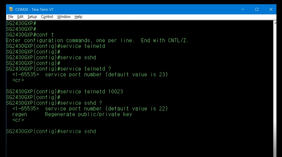 Telnet, SSH의 Service Port를 변경하려면, service telnetd, service sshd 뒤에 변경할 Port 번호를 입력합니다. Service Port 번호를 변경하지 않을 경우 Telnet은 23번, SSH는 22번의 기본 포트로 설정됩니다. (위 이미지 참고)
