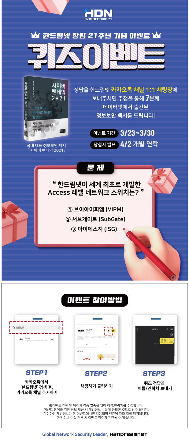 | 한드림넷 '산업용 네크워크 보안 솔루션' 체험 신청하고, '스마트 워치'받으세요! (0) | 2021.05.04 |