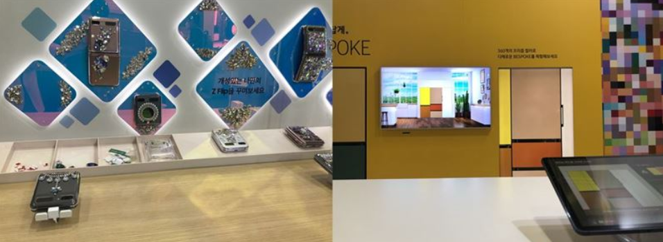 플래그쉽 스토어처럼 배치해놓은 한 구석에는 갤럭시 스마트폰이나, 태블릿, 워치 등 여러 제품들을 자유롭게 사용해볼 수 있었는데요, 저 지기는 갤럭시 Z폴드의 외관을 자유롭게 튜닝해보는 체험과 비스포크의 색상을 자유롭게 바꾸는 ZONE이 제일 재밌었답니다 ㅎㅎ