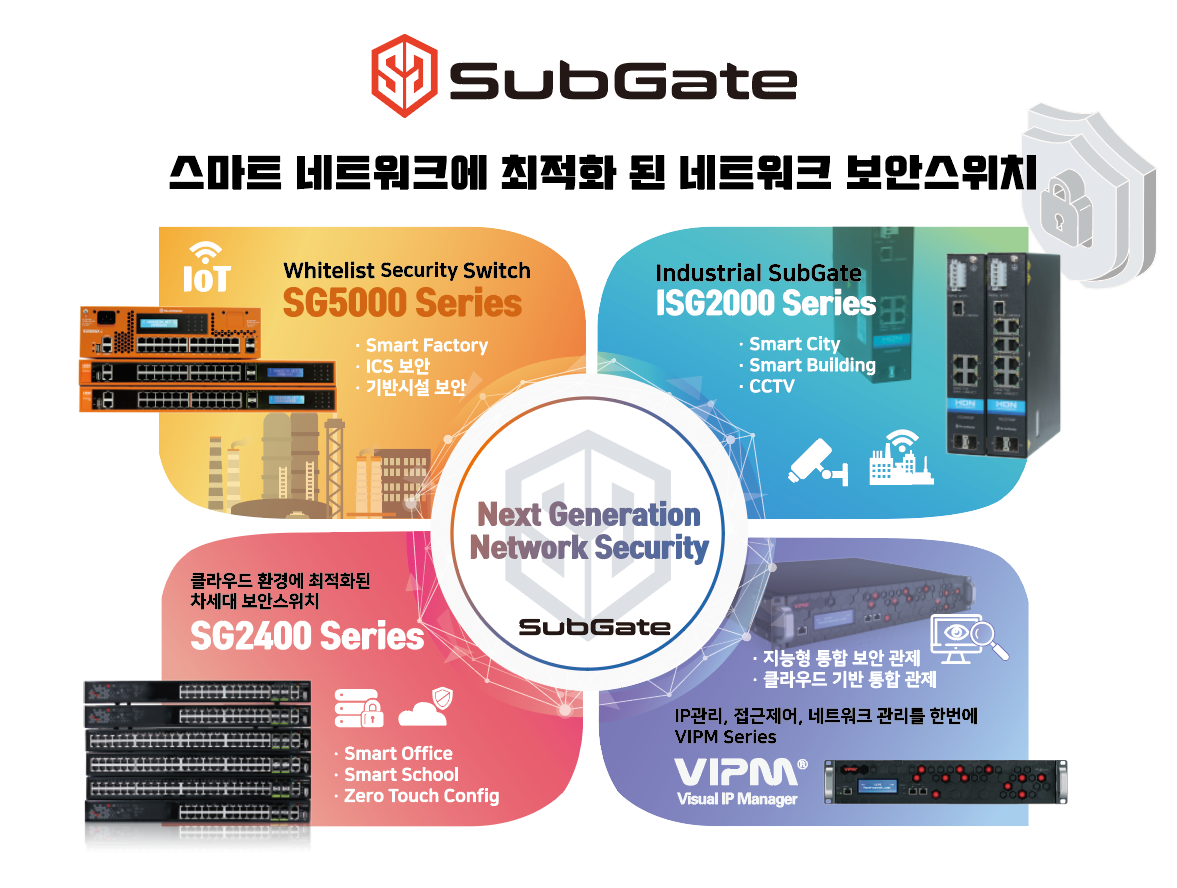 한드림넷이 2006년 세계 최초로 상용화한 네트워크 보안 스위치 ‘서브게이트(SubGate)’는 내부 네트워크에서 발생하는 보안 위협을 스스로 탐지, 차단할 수 있는 차세대 네트워크 스위치다. 서브게이트는 유해 트래픽 차단과 확산 방지를 통해 네트워크 서비스의 안정화와 운영의 편의성을 제공한다. 보안 스위치의 최대 장점은 무엇보다 이더넷 스위치의 성능 저하 없이 지능형 공격 방어 기능 수행이 가능하여, 네트워크 변경 없이 스위치 교체만으로 다양한 보안 위협으로부터 내부 네트워크를 보호하여, 쾌적한 내부 네트워크 서비스 운영 환경을 보장한다는 점이다.
