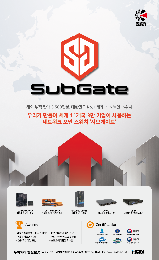 글로벌 네트워크보안기업 한드림넷(대표 서현원)이 세계 최초로 상용화한 보안스위치 ‘서브게이트(SubGate)’는 내부 네트워크에서 발생하는 보안 위험을 스스로 탐지해 차단할 수 있는 차세대