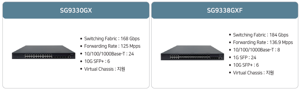 - 최대 6개의 10G 포트, 24개의 1G 포트, 24개의 10/100/1000Base-T 포트(SG9300 시리즈)